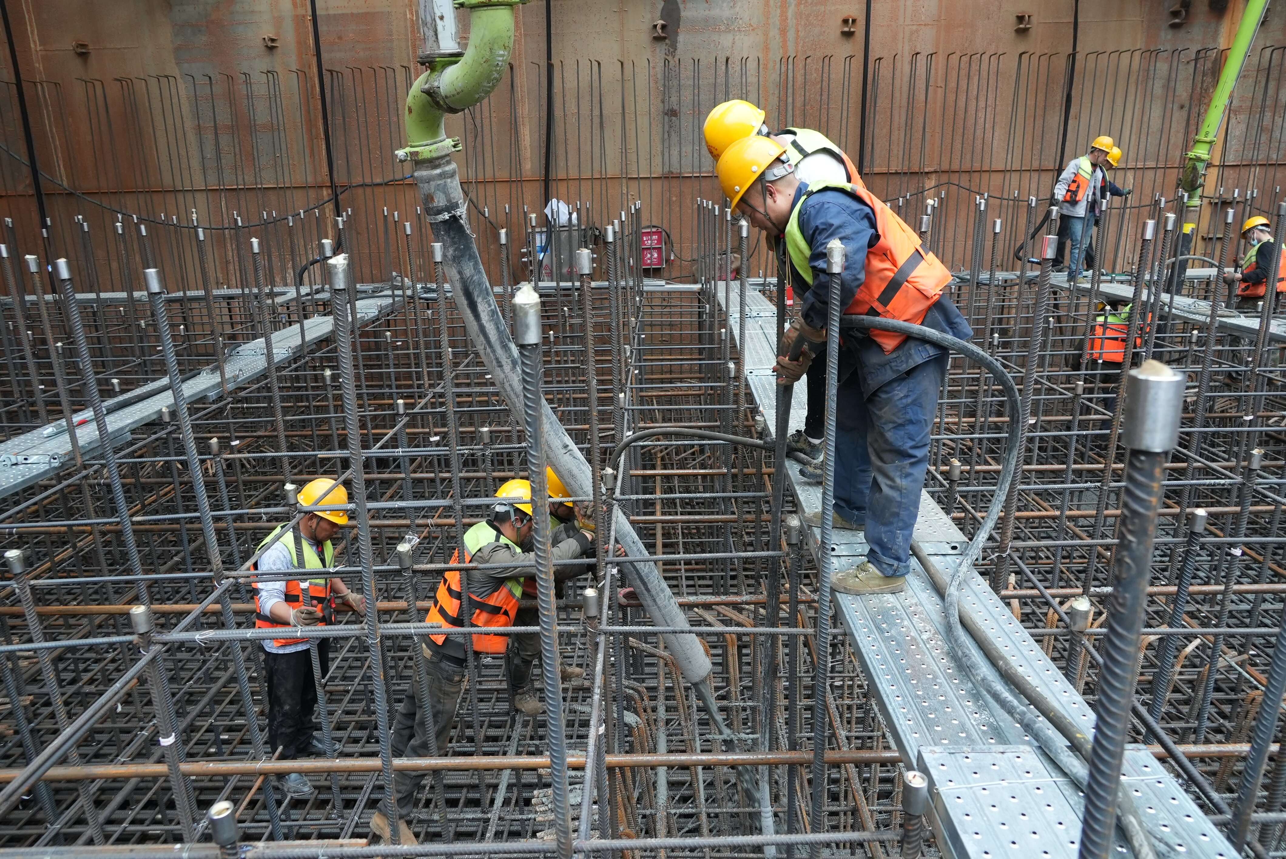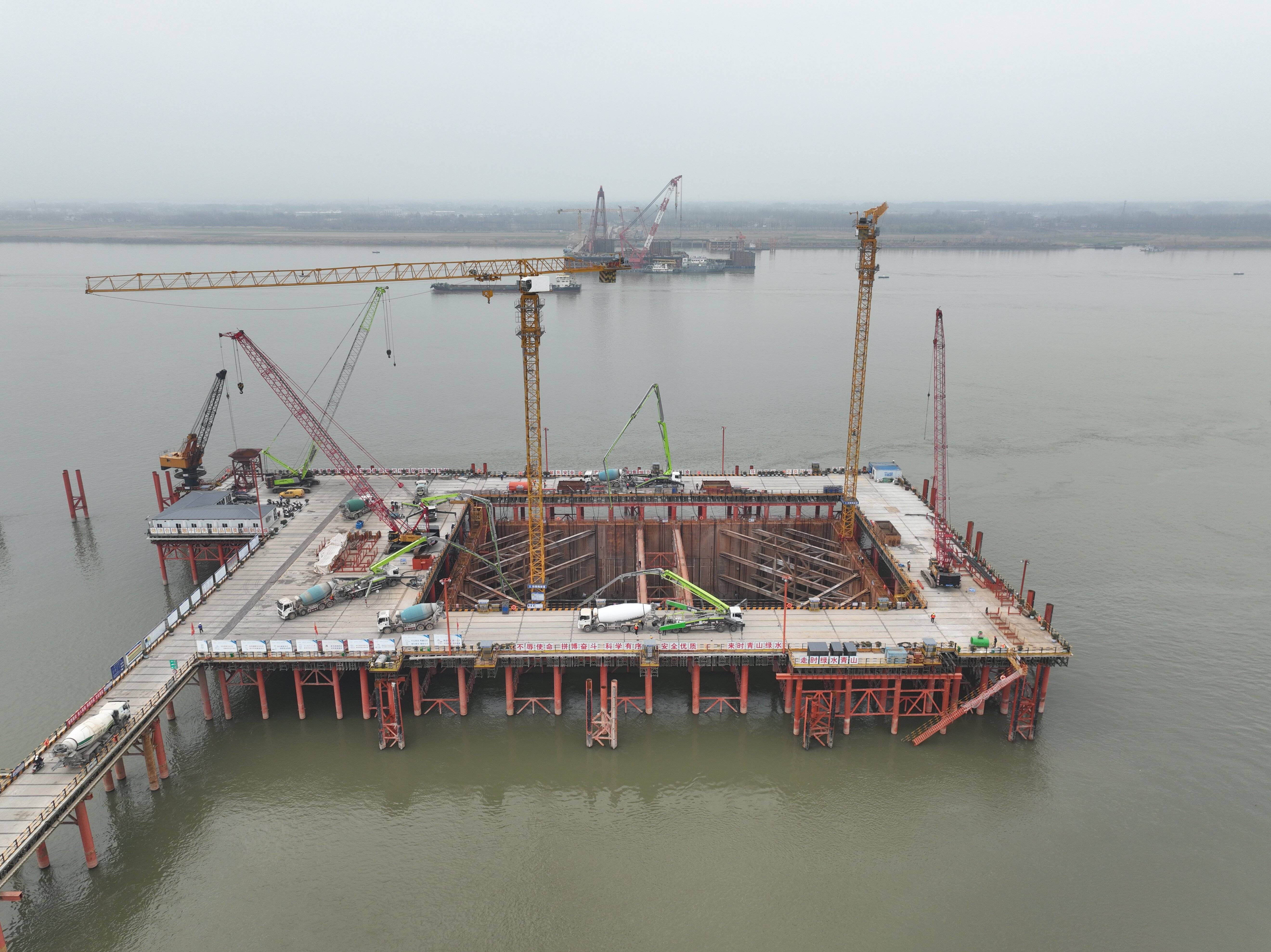 據(jù)悉,池州長(zhǎng)江公鐵大橋4號(hào)主墩采用雙壁鋼套箱圍堰的施工工藝,在圍堰內(nèi)展開(kāi)承臺(tái)施工,承臺(tái)的平面尺寸為75.6m×47.6m,厚度為7.0m,共需使用鋼筋4100余噸,需澆筑混凝土約25600立方米,為確保承臺(tái)施工質(zhì)量,項(xiàng)目部在施工過(guò)程中采用大體積混凝土施工工藝分兩次澆筑混凝土。本次澆筑為承臺(tái)首次澆筑混凝土,澆筑高度為3.5米,采用C45混凝土不間斷的進(jìn)行澆筑施工。